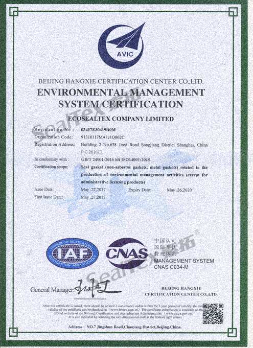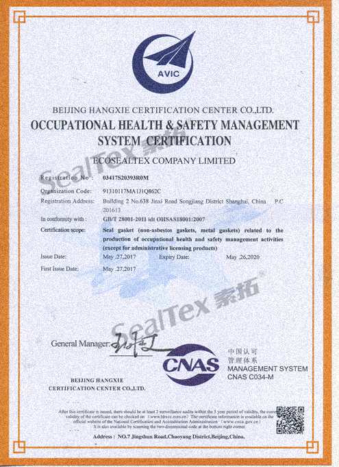為了更好的推動“禁止使用石棉制品”進程、推進環(huán)保事業(yè)、樹立企業(yè)形象,我司于2017年通過了ISO14001環(huán)境管理體系及OHSAS18001職業(yè)健康安全管理體系的認證并獲得認證證書。