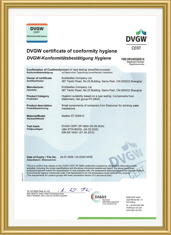 SealTex無石棉密封材料獲KTW-BWGL 飲用水認證