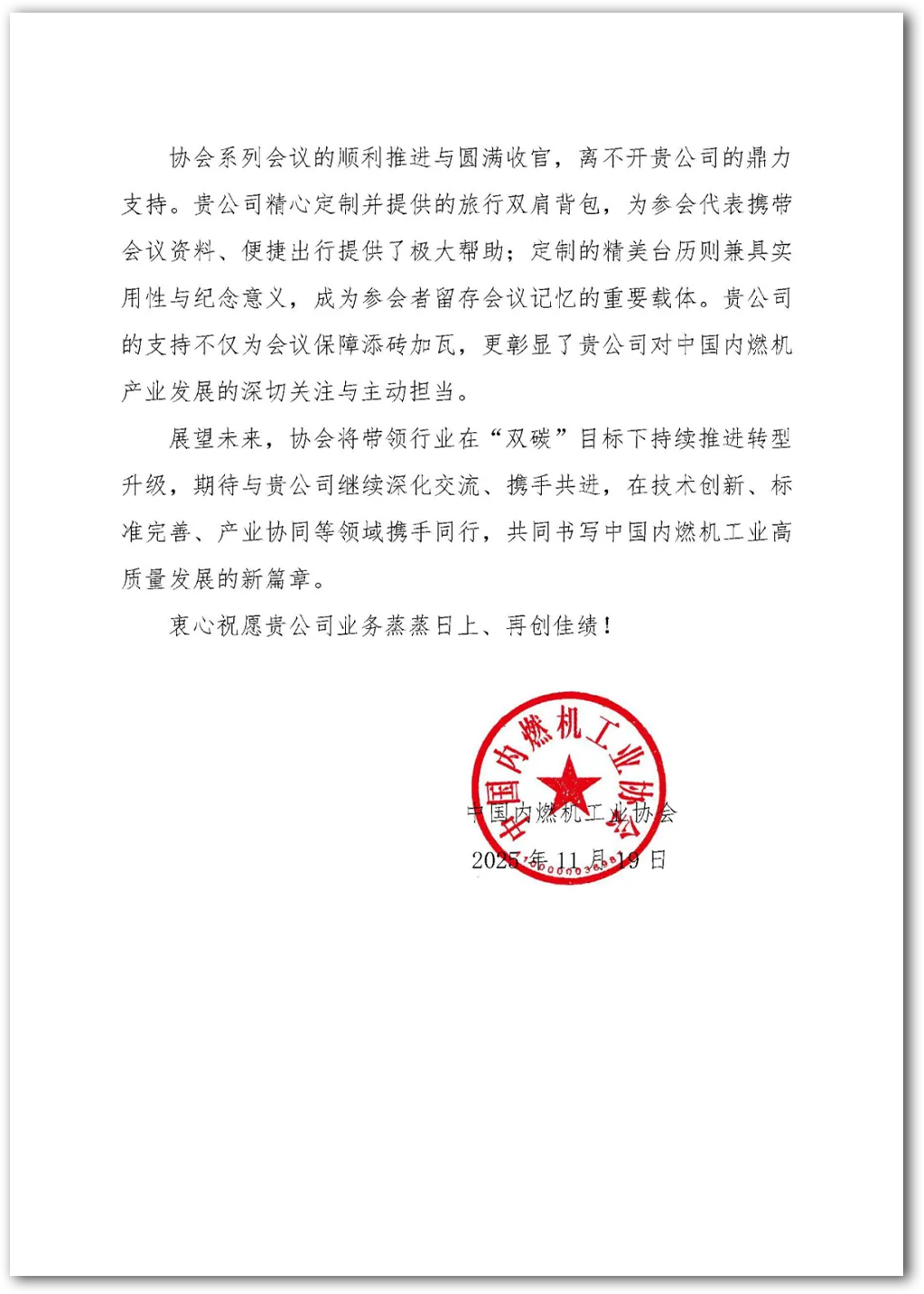 來自中國內(nèi)燃機工業(yè)協(xié)會的感謝信 近日,我司收到來自中國內(nèi)燃機工業(yè)協(xié)會的感謝信,也借此機會感謝協(xié)會的多年信任和支持,作為會員我們一直全力盡責盡職并很榮幸作為其中一員推動協(xié)會和行業(yè)的發(fā)展。并再次祝賀大會的成功召開。 上一個 返回列表 下一個