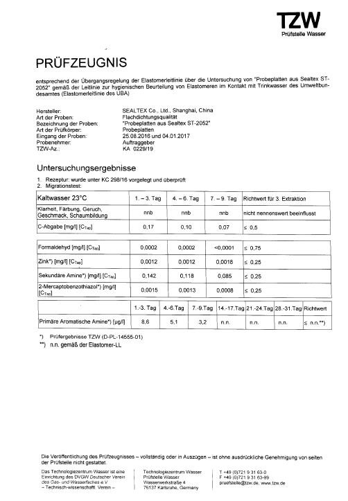 ST-2052無石棉墊片獲得飲用水認證KTW,W270 我司ST-2052無石棉墊片于近日通過了歐洲D(zhuǎn)VGW機構(gòu)的認可。獲得了歐洲飲用水方面認證證書。 包括DVGW KTW,KTW W270。 ST-2052是一種通用型的無石棉環(huán)保密封墊片材料,可以應(yīng)用于多種工業(yè)環(huán)境。更多應(yīng)用可來電咨詢 KTW證書 W270證書 上一個 返回列表 下一個