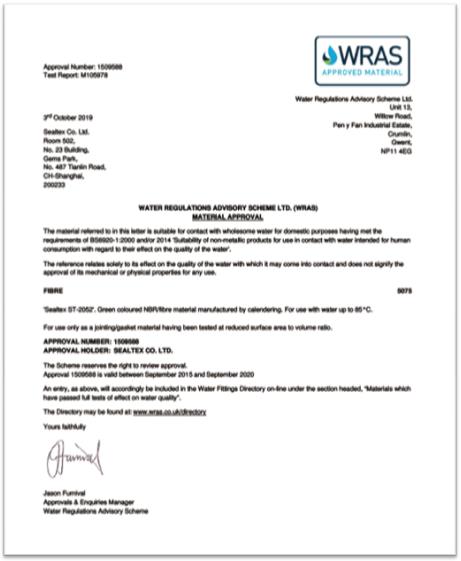 ST-2052無(wú)石棉板獲得英國(guó)飲用水WRAS的認(rèn)證證書(shū)