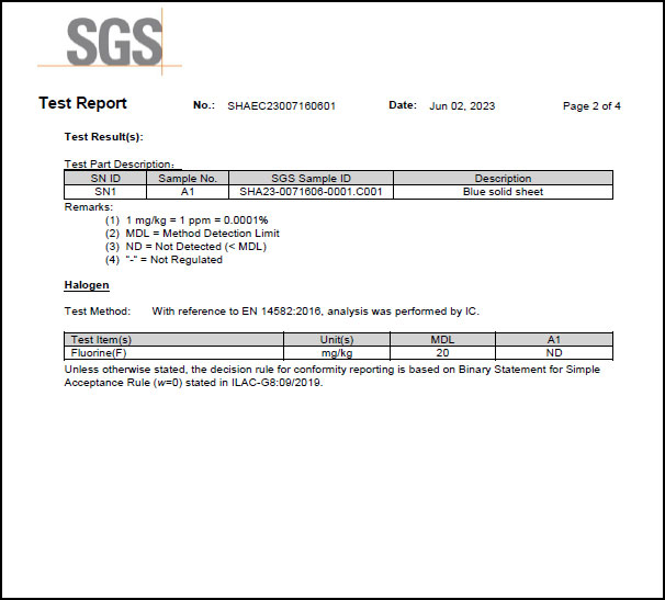為滿足客戶需求,近日SealTex索 ST-2058無石棉板通過了SGS進行的鹵素(氟)檢測,檢測標準EN 14582-2016,報告顯示未測出氟,報告部分截圖如下: