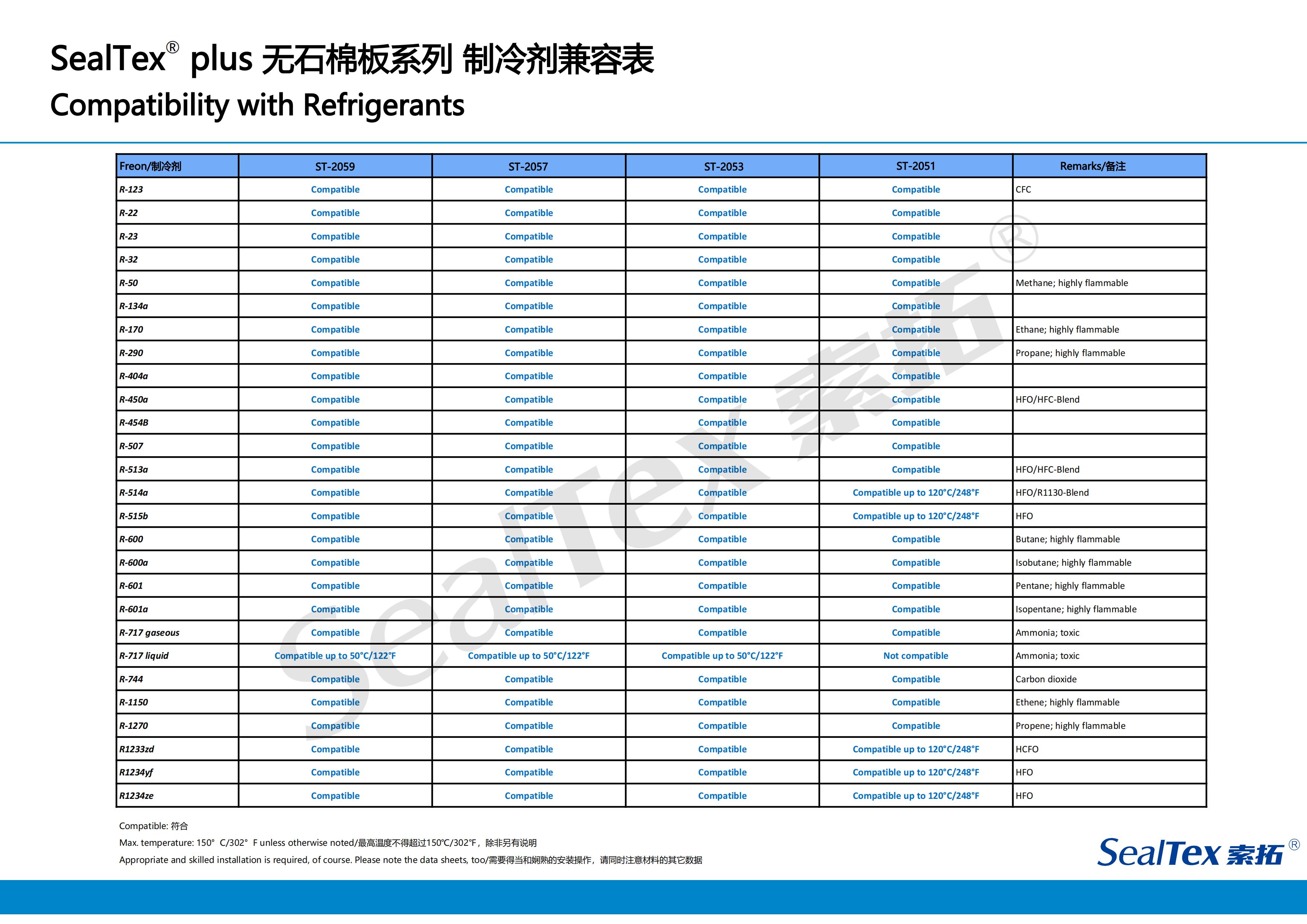 對于密封式和半密封式制冷壓縮機來說,每類制冷壓縮機可能會用到不同的制冷劑,一個能完全遏止制冷劑的可靠性密封系統(tǒng)是決定壓縮機長期穩(wěn)定運轉(zhuǎn)的重要因素。SealTex索拓公司為滿足制冷壓縮機用戶的要求,特別推出能在各種法蘭壓力下保持卓越密封性能的無石棉密封材料以滿足市場的需求。這些產(chǎn)品非常適用于半密封式壓縮機、冷卻裝置,對螺桿式和往復式壓縮機的應用尤其適合。例如:ST-2059、ST-2057、ST-2053ST-2051.