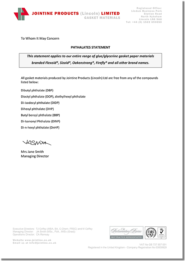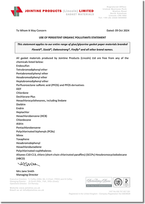JOINTINE是全球領(lǐng)先的高質(zhì)量耐油植物纖維紙墊片材料制造商,其名下的品牌產(chǎn)品Flexoid/福來德、Cranflex是一種環(huán)保的耐油纖維紙墊片材料,可廣泛應(yīng)用于汽車、發(fā)動(dòng)機(jī)、傳動(dòng)設(shè)備等行業(yè),如下是JOINTINE發(fā)布的環(huán)保聲明函。